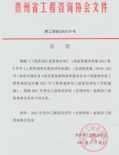 貴州關(guān)于2021年符合乙級(jí)資信評(píng)價(jià)(含預(yù)評(píng)價(jià))標(biāo)準(zhǔn)的工程咨詢單位的公告