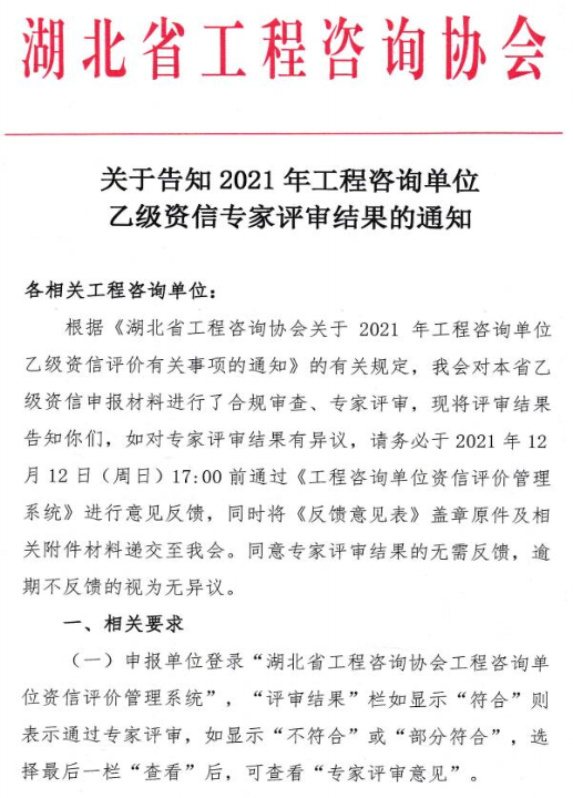 湖北省關(guān)于告知2021年工程咨詢單位乙級(jí)資信專家評(píng)審結(jié)果的通知