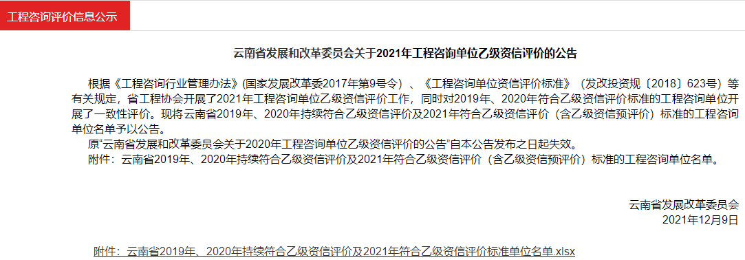 原“云南省發(fā)展和改革委員會(huì)關(guān)于2020年工程咨詢單位乙級(jí)資信評(píng)價(jià)的公告”自本公告發(fā)布之日起失效。