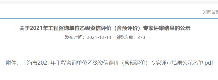 上海關(guān)于2021年工程咨詢單位乙級(jí)資信評(píng)價(jià)(含預(yù)評(píng)價(jià))專家評(píng)審結(jié)果的公示