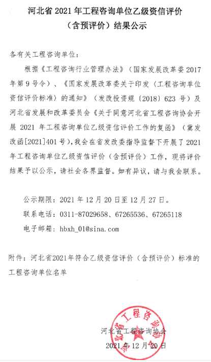 河北省2021年工程咨詢單位乙級(jí)資信評(píng)價(jià)(含預(yù)評(píng)價(jià))結(jié)果公示