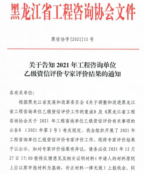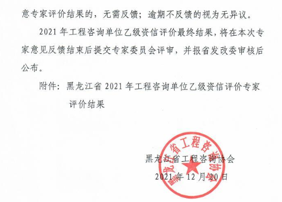 黑龍江關(guān)于告知2021年工程咨詢單位乙級(jí)資信評(píng)價(jià)專家評(píng)價(jià)結(jié)果的通知