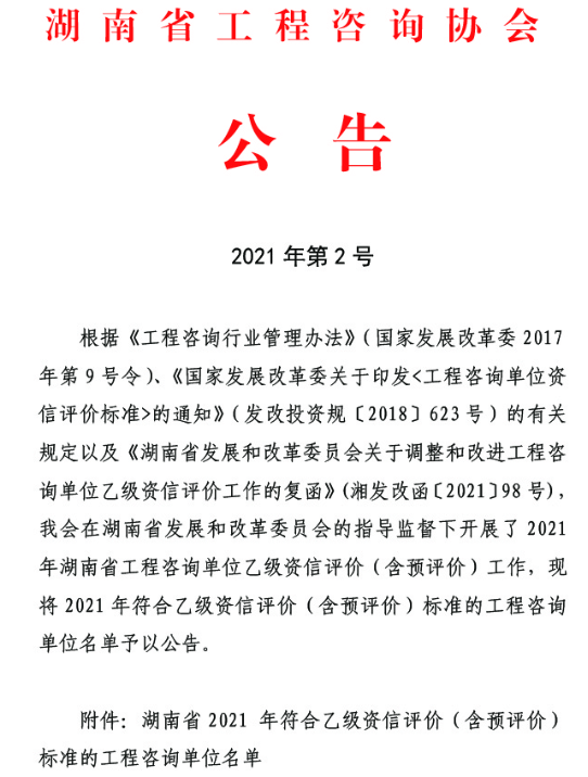 湖南省工程咨詢協(xié)會(huì)公告2021年第2號(hào)(乙級(jí)資信評(píng)價(jià)結(jié)果公告)