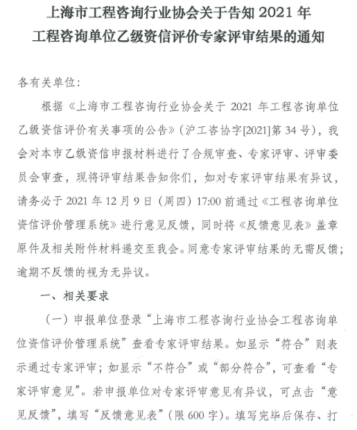 上海2021年工程咨詢單位乙級資信評價專家評審結(jié)果通知