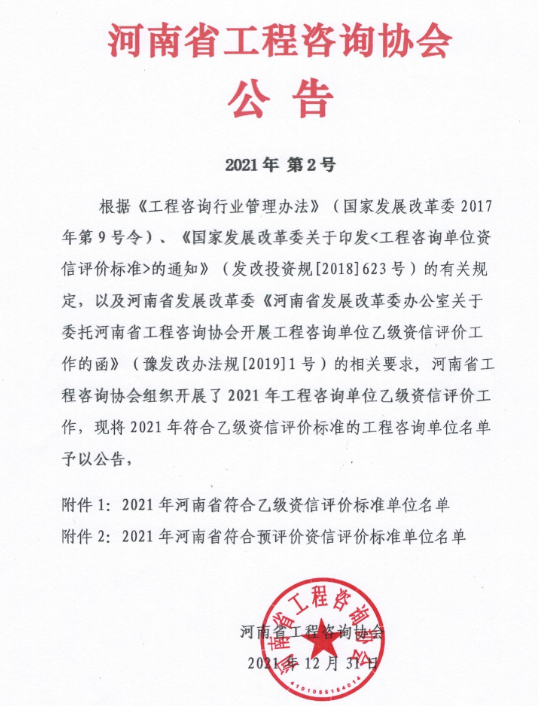 河南關(guān)于2021年乙級(jí)資信評(píng)價(jià)評(píng)審結(jié)果的公告