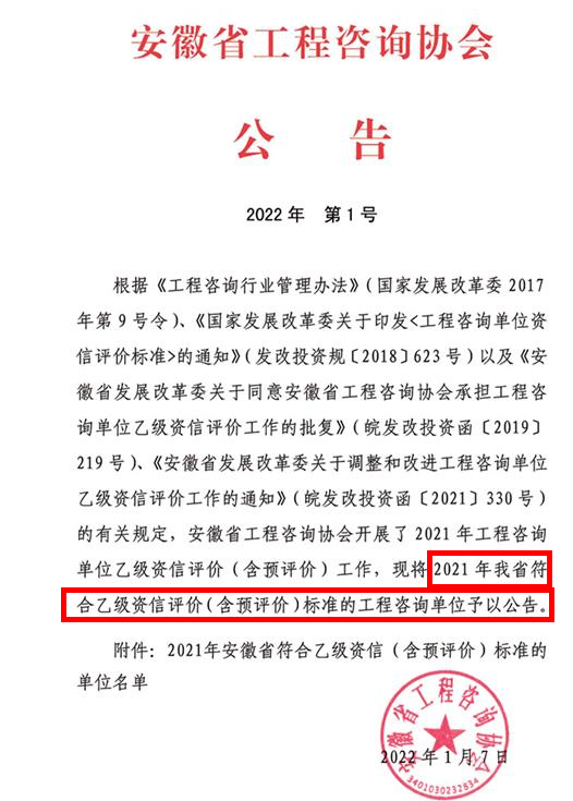 安徽省工程咨詢(xún)協(xié)會(huì)2022年第1號(hào)公告