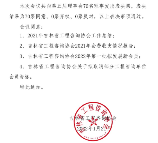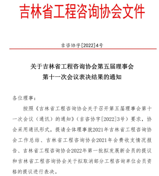 關(guān)于吉林省工程咨詢協(xié)會第五屆理事會第十一次會議表決結(jié)果的通知