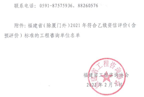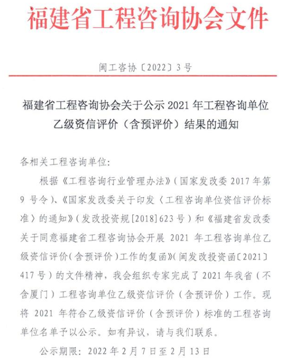 福建工程咨詢協(xié)會公示2021年工程咨詢單位乙級資信評價(含預(yù)評價)結(jié)果