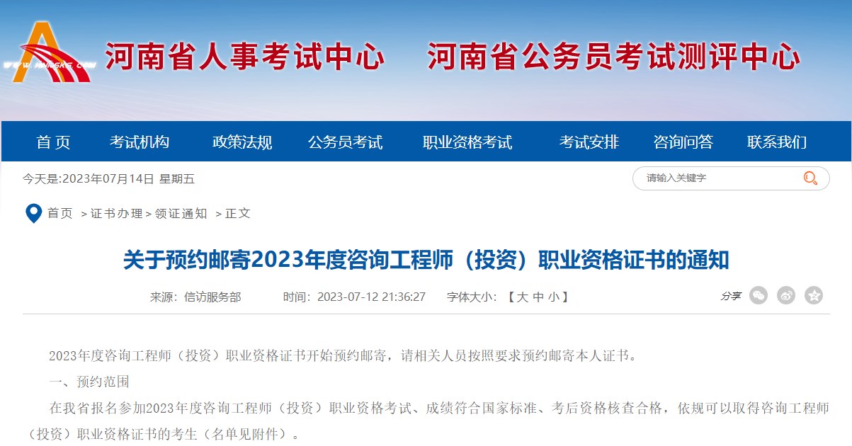 河南省人事考試中心發(fā)布《關(guān)于預(yù)約郵寄2023年度咨詢工程師(投資)職業(yè)資格證書的通知》,預(yù)約期為2023年7月13日至8月4日,逾期不申請(qǐng),不再受理郵寄申請(qǐng),詳情如下: