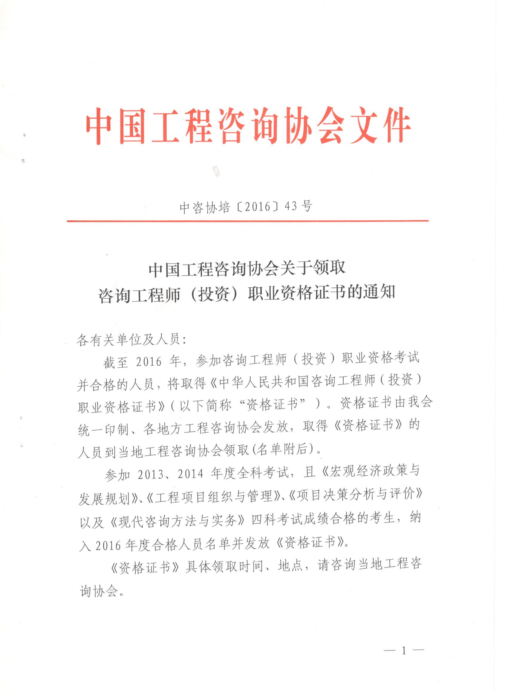 中國工程咨詢協(xié)會(huì)關(guān)于領(lǐng)取咨詢工程師(投資)職業(yè)資格證書通知