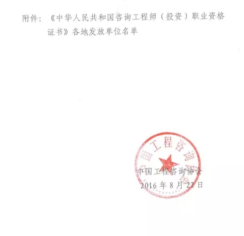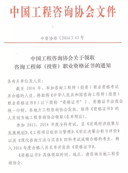 中國工程咨詢協(xié)會(huì)公布《中國工程咨詢協(xié)會(huì)關(guān)于領(lǐng)取咨詢工程師(投資)職業(yè)資格證書的通知》,截止2016年,參加咨詢工程師(投資)職業(yè)資格考試并合格的人員,將取得《中華人民共和國咨詢工程師(投資)職業(yè)資格證書》。